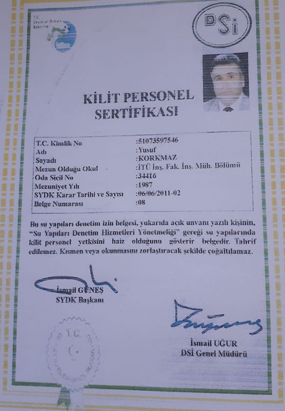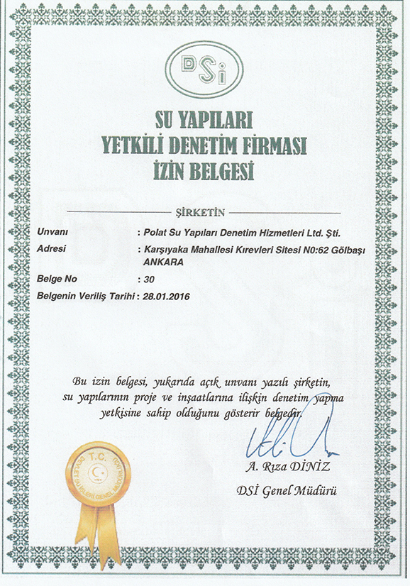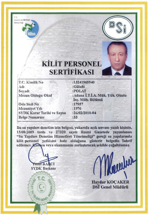 DSİ tarafından verilen Kilit Personel Sertifikası, Su Yapıları Yetkili Deneti Firması İzin Belgesi ve Polat Su Yapıları Denetim Hizmetleri Firmasının sahibiyim.